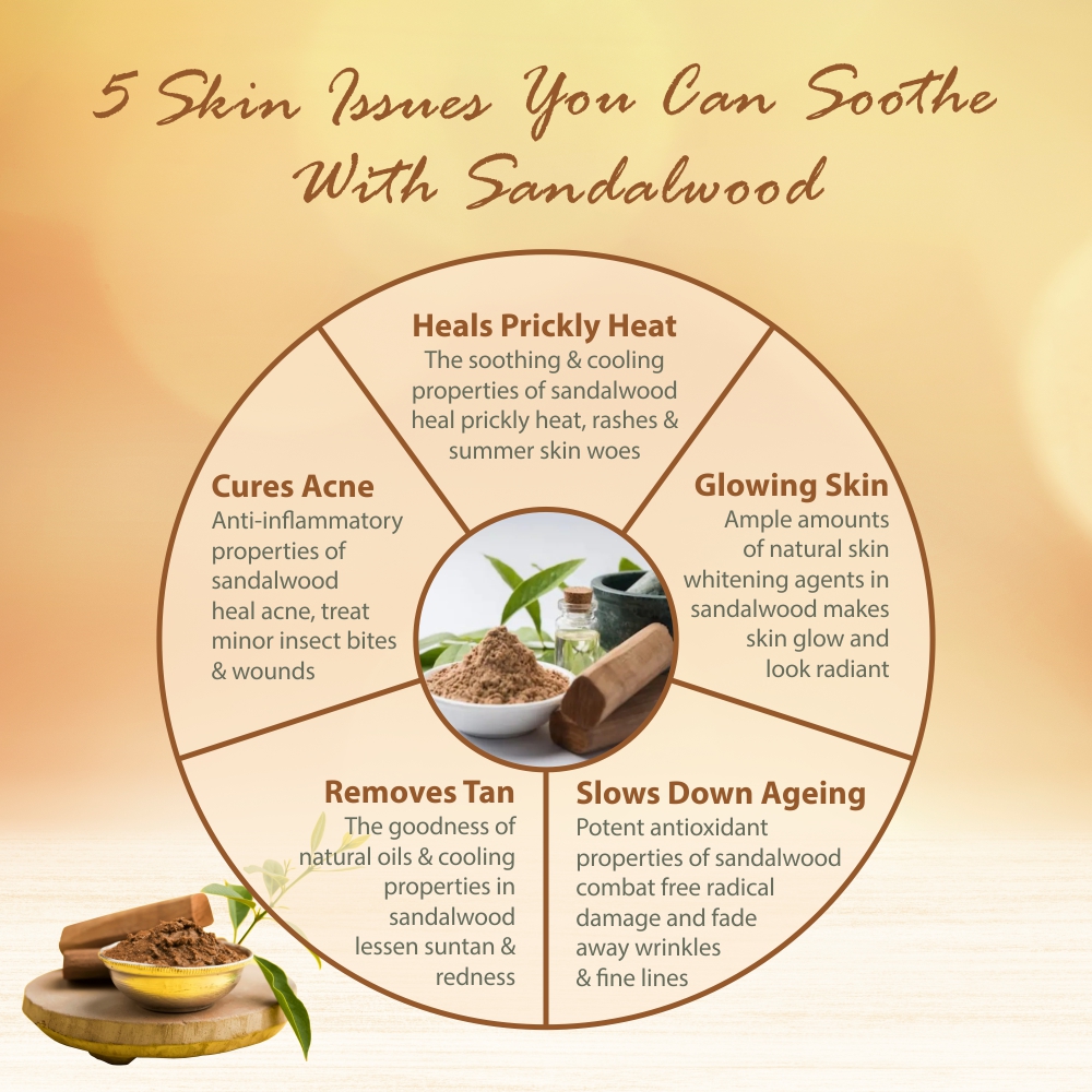 Sandalwood has natural toning properties that help reduce age spots and promote even skin tone. With powerful antiseptic and antibacterial properties, Sandalwood helps zap zits while preventing the spread of spot-causing bacteria. Its anti-inflammatory action helps reduce the redness, swelling, and scarring.